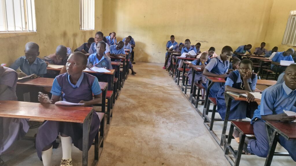 Students take part in classroom-based learning activities supported by Caritas Poland. The images show children sitting at shared desks, writing, reading, or working on assigned tasks. The classroom is modest, with essential materials used for basic education.