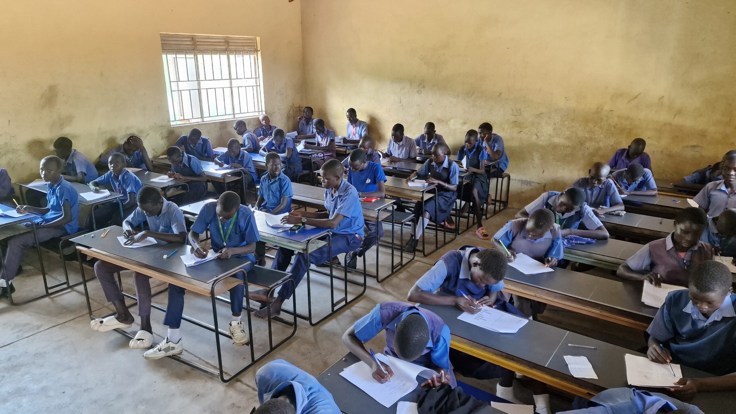 A classroom of students is shown participating in a written lesson inside one of the Don Bosco educational facilities. The students are seated at shared desks and working on their assignments. This activity is supported in cooperation with Caritas Austria, focusing on providing basic education for children and adolescents.