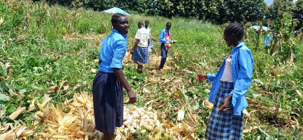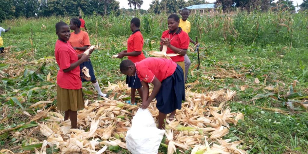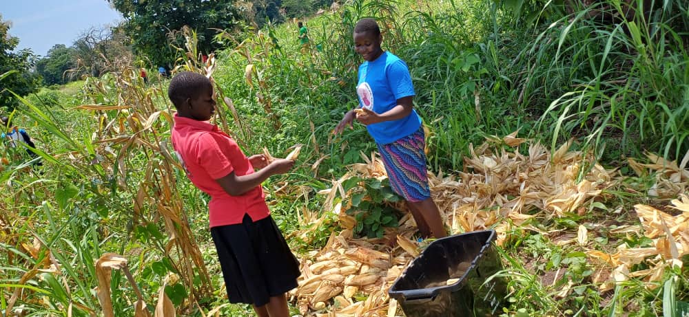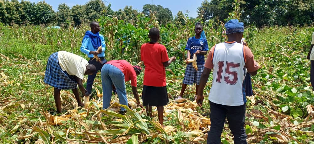 As part of a livelihood support initiative, children or community members help harvest maize in local fields. The images show participants collecting maize cobs and gathering them into piles. This activity contributes to local food supply and promotes agricultural skills.
